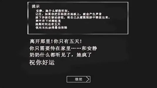 1、游戏开始你有五天时间可以逃跑,醒来后,你需要寻找道具,然后去别的房间寻找,注意,不要让奶奶看见你,不然会有危险。