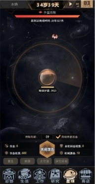 战斗玩法的核心就是研究武器,前期我们以轨道炮和激光炮为主。强化这两个武器,强化的越高,强化等级越高,出高级词条的概率越高。前期没有那麽多资源的情况下出个差不多的词条就可以了。告诉大家一个小技巧,可以将目标年龄调到59岁,这样每个轮回都是从59岁开始攻击可以让自己可以多活一段时间。