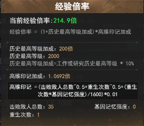 那经验倍率的来源是什么呢?通过游戏说明,我们可以知道每个研究和工作的经验倍率是算出来的。影响参数是历史当前研究/工作的历史最高等级,然后就是高维印记加成。历史最高等级很好理解,慢慢刷就好。重点就又回到上文提到的高维印记加成,也是这篇攻略的重点了,高维印记加成是每次轮回后会增加的一个值。影响高维印记的参数有:击败敌人总数,基因记忆强度,重生次数。这三个参数都是只会增加,不会减少的。所以只要大家坚持玩下去,高维印记就会一直增加。高维印记一直增加,经验倍率就会一直增加。经验倍率一直增加,那把研究学到满级,不是指日可待?