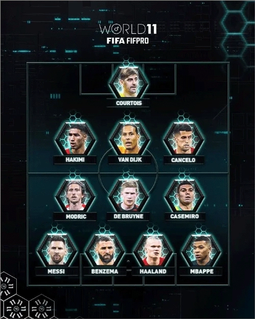 FIFA年度最佳阵型为334。梅西、姆巴佩、本泽马、哈兰德领衔锋线,而转战沙特的C罗遗憾落选。