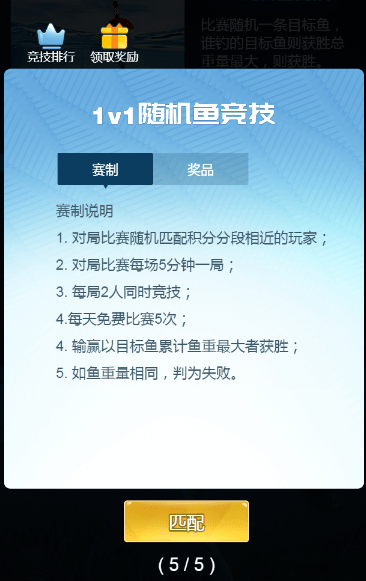 这是单人对决的玩法,主要是钓目标鱼为主,不过最后取胜的是目标鱼的总重量,限时5分钟,每天有5次免费比赛次数,下面就是1v1随机鱼竞技的赛制说明,感兴趣的钓友们可以看一下。