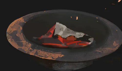 12、将刚刚获取的所有道具统统烧掉,爬上棺材以触发剧情,火盆里有一张纸条,随后进入尾声。