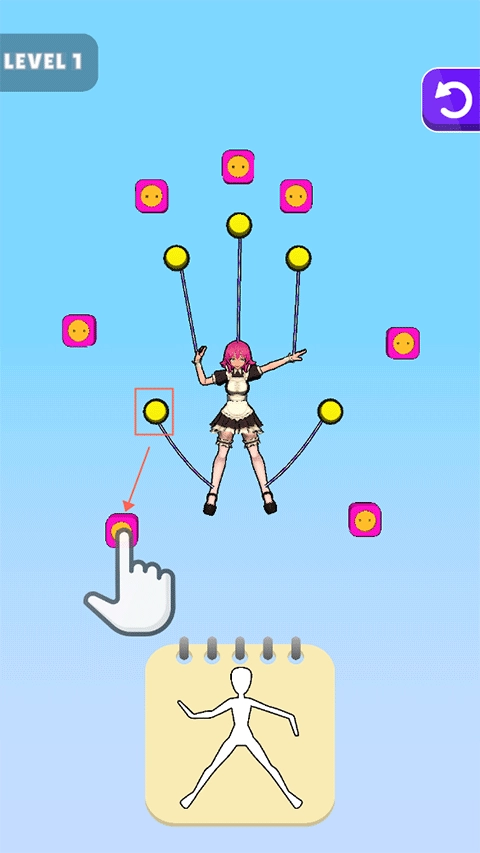 1. 依据屏幕下方的示例图片,对木偶开展连线操作。