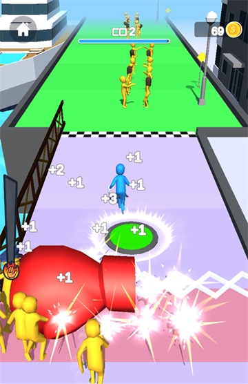 2. 踩到地上的绿色圆圈,就会触发大拳头机关,将追赶你的行人击飞。