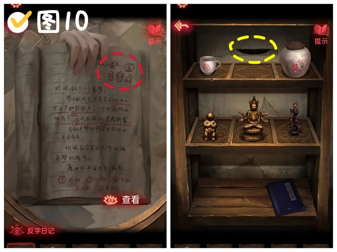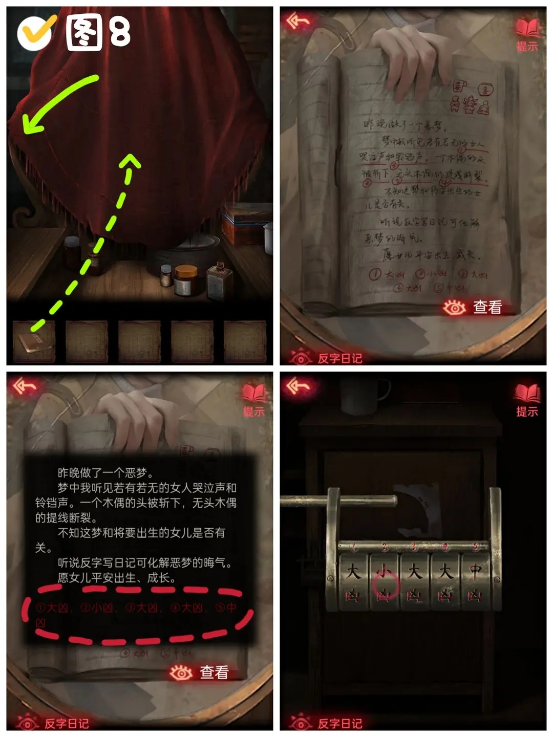 6.拿下梳妆台镜子上的红布,对着镜子看反字日记,获得线索大凶-小凶-大凶-大凶-中凶,解锁下方右侧柜子,获得〔钥匙〕。(图8)