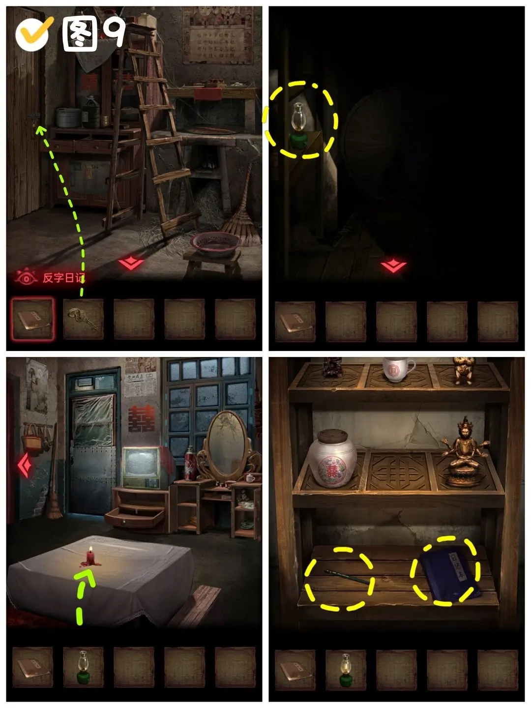 7. 拿起钥匙,打开厨房左侧的门,走进暗室,取走〔煤油灯〕。来到客厅,用桌子上的蜡烛将煤油灯点燃,随后再次返回暗室。接着,拿走左侧架子上的〔铅笔〕,翻开日记本,从中获取〔半张照片〕。(图9)
