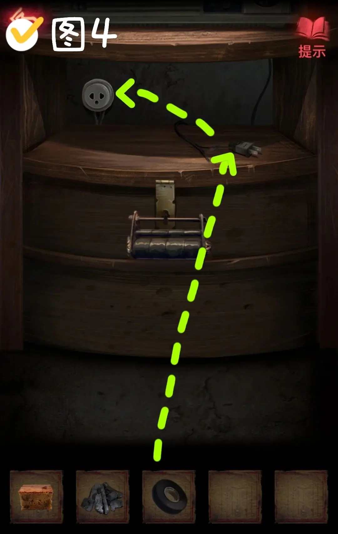 2.向左转,在木梯上获取〔煤炭〕。取下木梯上的白布,点击木梯两次以移动木梯,留意木梯上方铃铛从高到低的符文顺序,接着解锁下方柜子右侧的抽屉,从而得到〔绝缘胶布〕。(图2;图3)