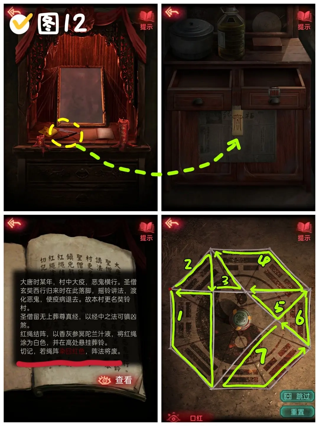 10. 前往地下室,在供奉桌上拿到〔剃须刀〕。接着回到厨房,用剃须刀划开柜门上的符纸,从而获取〔口红〕。依据地下室供奉桌上的文字记录,若要破除绳阵,需把绳子染成红色,就像图中所示,从奇数点开始操作即可,方法并非只有一种。绳阵破除后,在阵眼处得到〔半张照片〕。(图12)