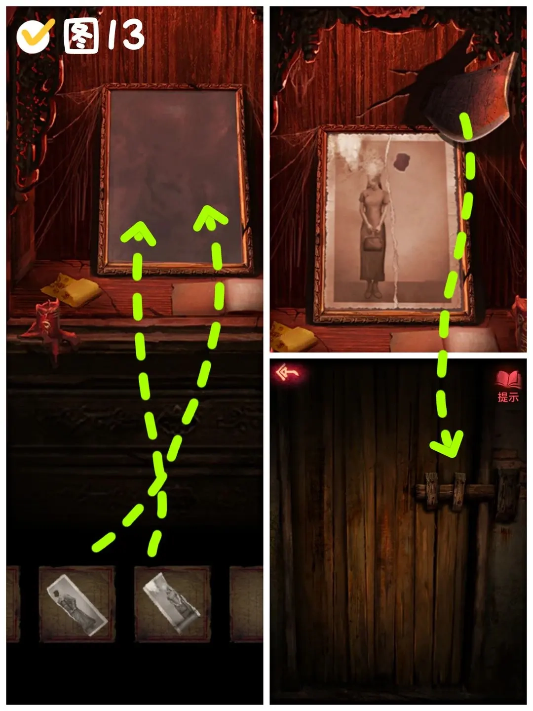 11.将两个半张照片放入相框,获得〔鬼头刀〕。用鬼头刀砍下左侧门上的木插,逃脱。(图13)
