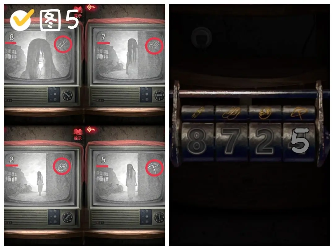 3. 拿绝缘胶布修补电视机下方的电源线,接着连接电源。点击换台按钮,留意各频道所对应的墙上图案,分别是2花、5伞、7鞋、8口红。之后,用8725作为密码,解锁电视机下方抽屉的锁,从而获得〔糖瓜〕。(图4;图5)