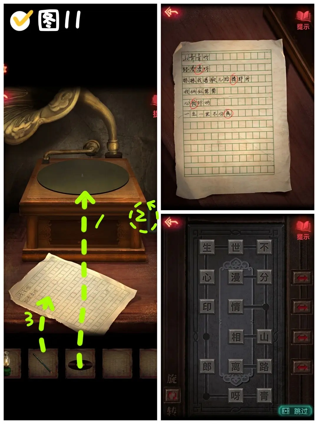 9. 轻点蓝伞与白伞。接着,把唱片放置到留声机上,再点击摇杆来播放音乐。随后,拿起铅笔在稿纸上记录下歌词。留意红圈里的文字,按照从上至下的顺序为漫 - 情 - 相 - 离 ,依据此顺序去调整地下室门锁的装置。(图11)