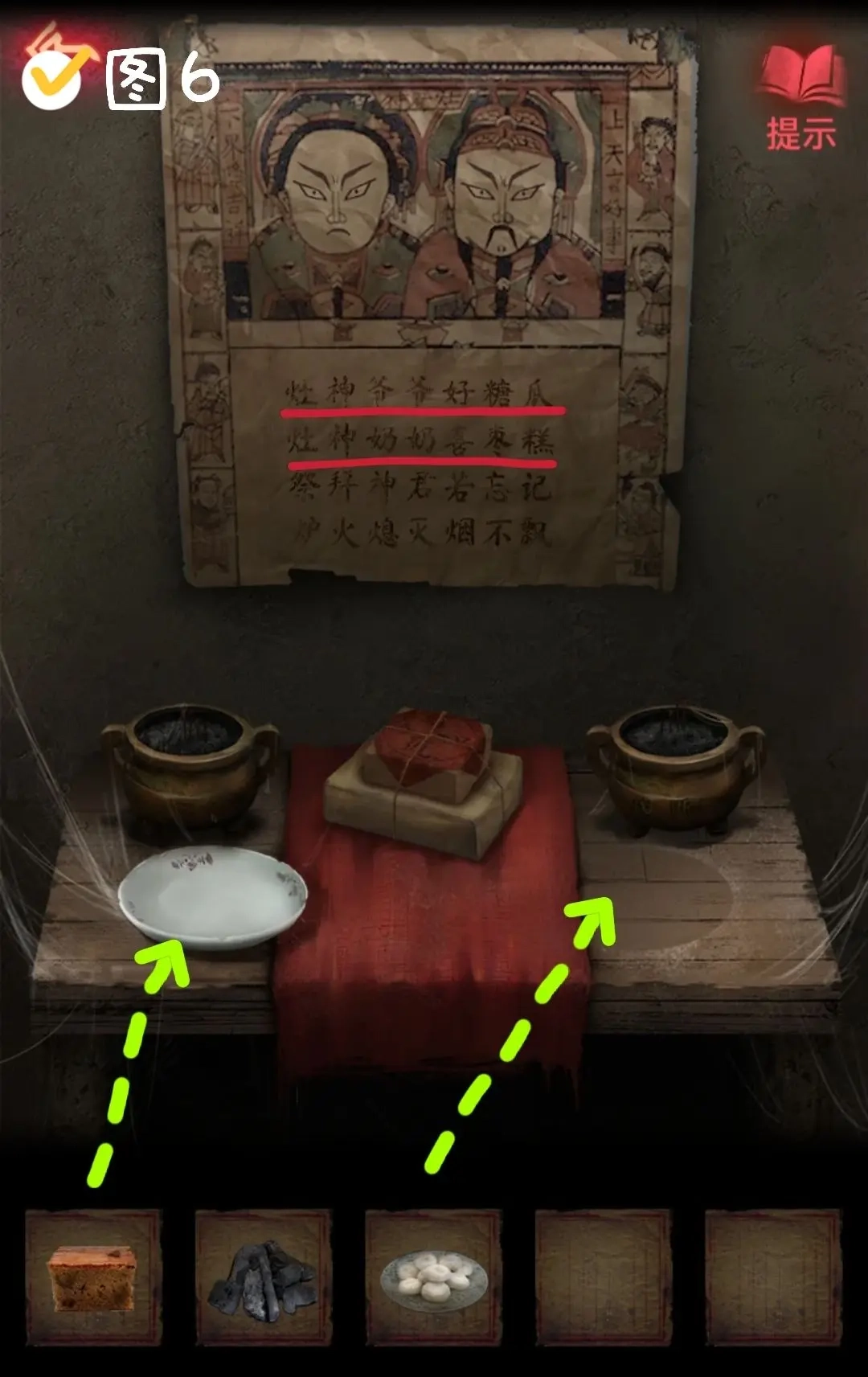 4. 轻点灶台上方的供桌,依据墙上的打油诗能够得知,爷爷偏爱糖瓜,而奶奶钟情枣糕。把枣糕放置在盘子里,将糖瓜置于右侧的空位,只有完成这一步,才能够点燃炉火。(见图6)