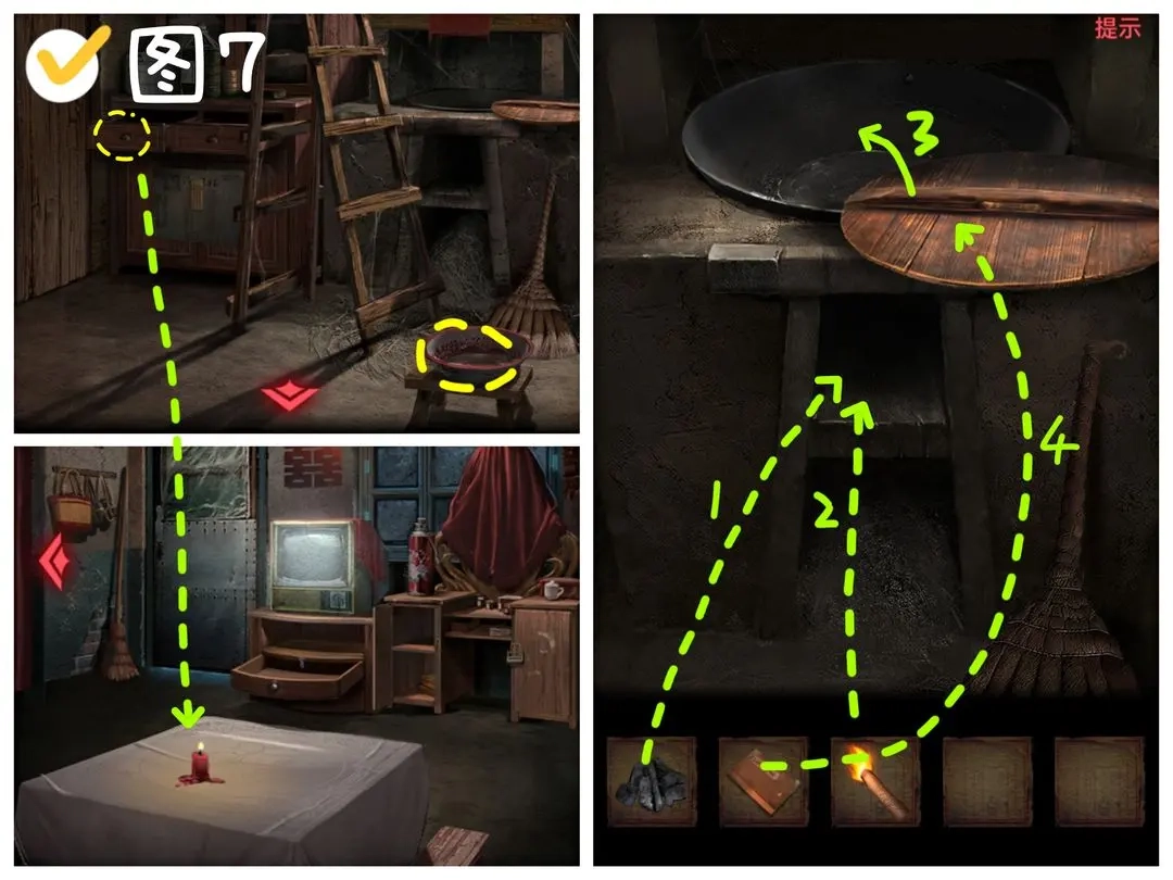 5. 在木梯旁柜子的左侧抽屉里,能找到〔干玉米棒〕。于灶台前的水盆中,可以获取〔湿日记本〕。拿起客厅桌子上的蜡烛,用它点燃玉米棒,接着把煤炭放进灶台,再用已点燃的玉米棒引燃煤炭。随后盖上锅盖,将湿日记本放在上面烘干,这样就能得到〔反字日记〕。(图7)