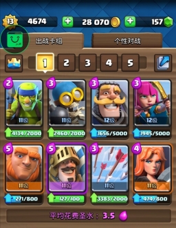 打法:在对方进攻的路线放下女巫清场,女巫快过桥的时候下巨人平推。炸弹人守人海,火枪手、哥布林、弓箭手防守+辅助进攻,骑士防守,火球备不时之需。