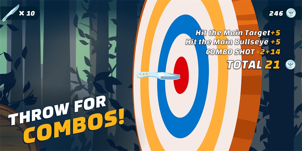 1在每一关的任务里,都会出现一个圆形果盘,你需要操控飞刀精准地射向它。
