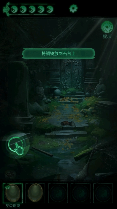 2、将【左侧铜镜】与【右侧铜镜】放置于石台之上,接着调整铜镜的角度;点击龙头三次,使光线投射形成北斗七星的形状,以此激活石门中间的四象八卦机关