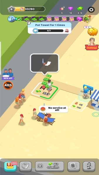 丰富建设玩法:提供种类繁多的建筑类型,从休闲娱乐设施到生活服务场所,玩家可自由规划海滩布局,发挥创意打造独具个性的旅游胜地,每一次建筑选择与摆放都影响着游客吸引力与收益。