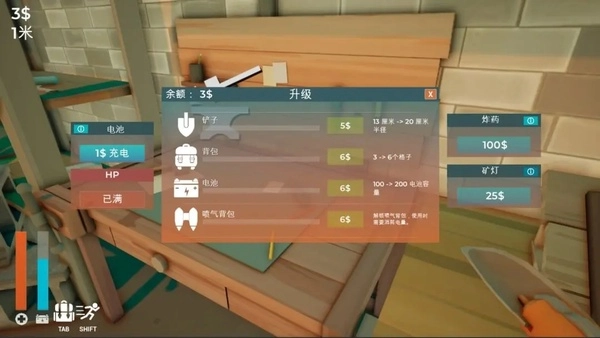 游戏中可供活动的范围仅包含后院与一间工作间。后院被我们当作“矿区”,在这里可以用铲子挖掘地面来寻找矿石,找到的矿石能够拿去出售,以此补充能量并为自己的设备进行升级。