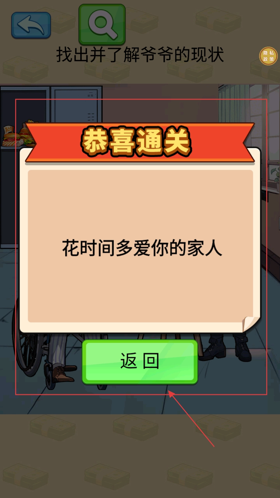 4、完成关卡后会出现【恭喜通关】的提示,点击【返回】按钮就能进行其他后续操作。
