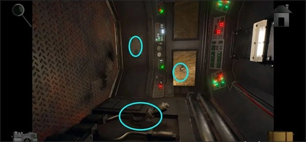 5、用钥匙打开区域左边的储藏室,进入后观察墙上的提示并拿走桌子上的「断线钳」。接着点击左边的机关,转动轮盘降下锁链。