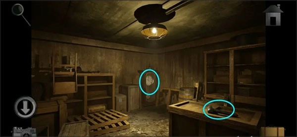 7、回到储藏室用铁链将钩子和地下室门把手进行连接,然后用锁固定铁链,再转动轮盘升起地下室的门。接着进入地下室拿走箱子上的「摇杆」,再记住钟表上的时间提示。