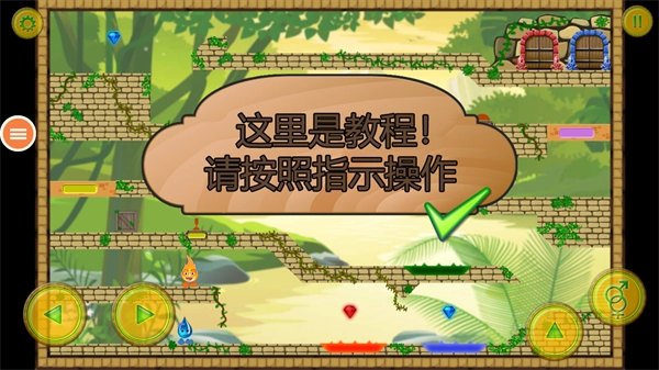 游戏里左下角的按键用于操控角色前进与后退,右下角有两个按键,分别是切换冰、火角色和跳跃功能;首次游玩会有新手教程,跟着提示完成关卡就能熟悉整个游戏流程。