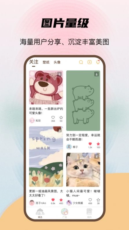 3、操作简单,一键下载就能把你的桌面变得十分个性化。不管是静态壁纸,还是动态壁纸,这里都有。感兴趣的伙伴快来下载吧。1、【畅所欲言】无论你是每日忙碌的打工人,还是痴迷于二次元等领域,在这里,都能邂逅与你同频的伙伴,尽情交流。 2、【海量美图】众多用户踊跃分享,积累了丰富多样的精美图片。 3、【动态壁纸】持续更新各类风格的动态壁纸,赋予你的手机独特魅力。