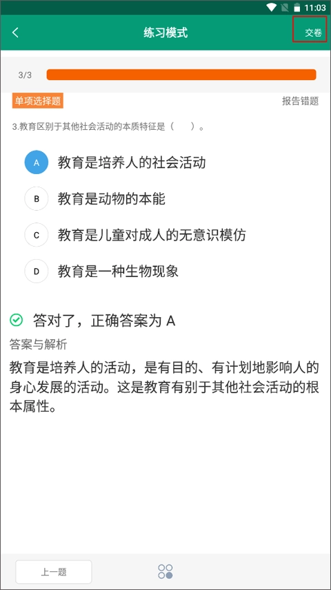 2、进入到练习模式之后点击右上角的“交卷”按钮。