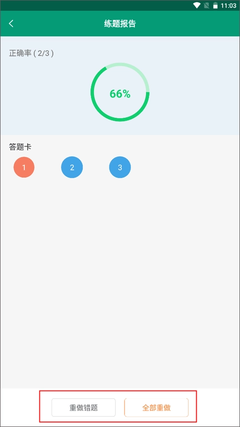 3、这时就会自动生成一份练题报告,下方有两个功能选项,点击“全部重做”。