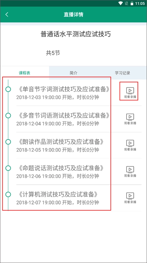 2、在直播详情页面中的课程表里,选择你想观看的录播视频。