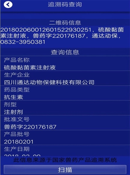 3、扫描完成后,用户可以看到兽药的详细信息,例如生产日期、生产企业、兽药名称、规格、批准文号等信息。此外,用户还可以看到兽药的发货目的地等其他相关信息。