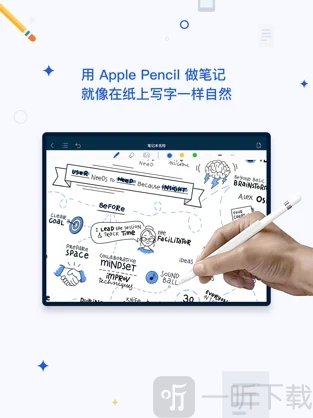 2. 顶部设有一排小工具,操作简便,即便是新手也能轻松上手。连接 iPad Pencil 后,可直接进行笔记记录。您能够自主挑选笔及荧光笔的颜色与大小。无论是插入图片还是使用套索功能,都极为便捷好用!