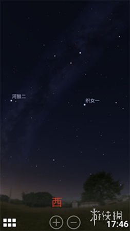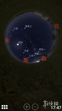 2、夜幕降临之时,应用会自动开启夜市模式。在此模式下,方位字体将呈现红色,方便在昏暗环境中进行观察。用户可通过点击界面下方的“+”与“-”,对观测距离进行调整。