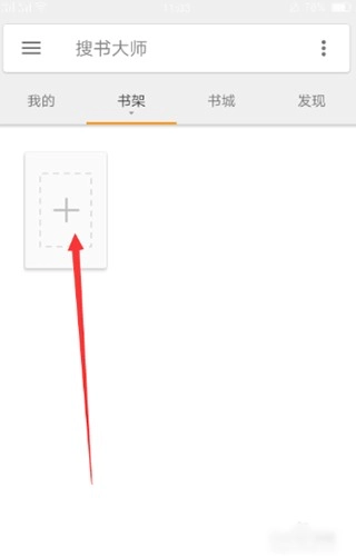 1、首先在手机上打开搜书大师,在书架界面点击“+”号图标;