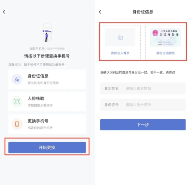 ②点击“更换手机号”后进入以下页面,继续点击“开始更换”,进入下一步,上传身份证照片,姓名、身份证号根据上传的图片自动识别。