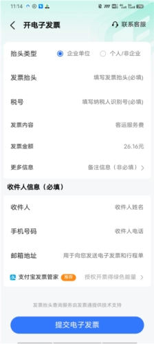4、选择发票类型,抬头发票、税号、发票内容以及收件人姓名号码等,最后提交电子发票即可。
