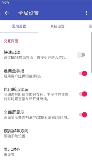 3、把金手指一览打开即可,另外诸如全屏显示、断点续玩等功能也都是在这里开启的