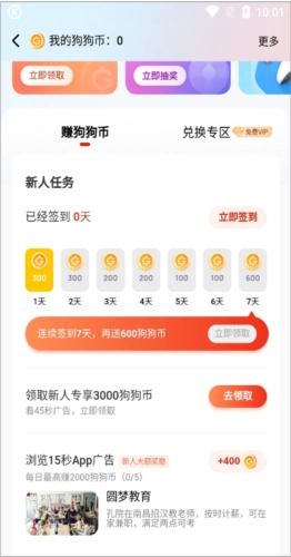 在打开的新页面中通过做任务免费赚取平台酷狗币
