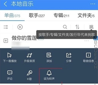 2、挑选一首歌曲作为铃声点击歌曲旁边的三个小点,然后在菜单点击设为铃声。
