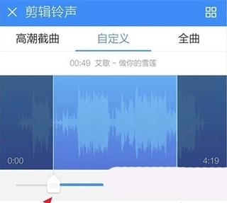 3、然后进入歌曲剪辑的界面,看到歌曲下方有两个圆点拖动两个圆点选择铃声的范围,选择好了可以点击播放按钮进行试听。