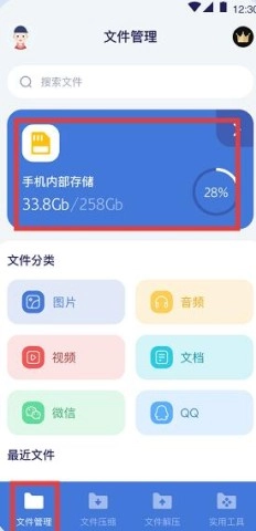 1、打开软件后,点击文件管理,即可查看手机内部存储空间的使用情况。
