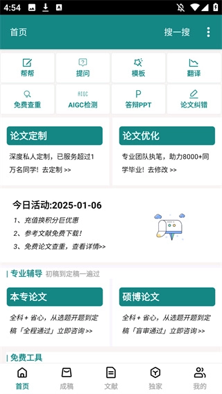 论文帮不仅能为用户提供大量常用的模块工具,还拥有海量文献资源,方便用户查询。这款堪称保姆级的论文助手工具,还支持用户随时随地进行查重,助力你的论文创作之路更为顺畅。