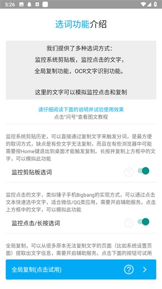 开启后,复制或点击文字,会弹出悬浮球,先点击悬浮球才会触发分词,多一步操作,可以减少误触发。如果不显示悬浮球,请检测“悬浮窗权限”,全局复制和OCR中启动分词不需要再点击悬浮球