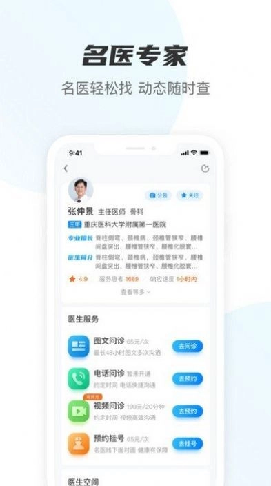 2、名医在线是一款非常实用的医疗服务类软件,提供给用户的医疗服务非常的专业,包含了大量的名医用户,可以在平台上面进行直接的预约,同时也可以进行直接的挂号,省去了大量的时间,患者有任何的疑问,都可以在平台上面进行直接的咨询。