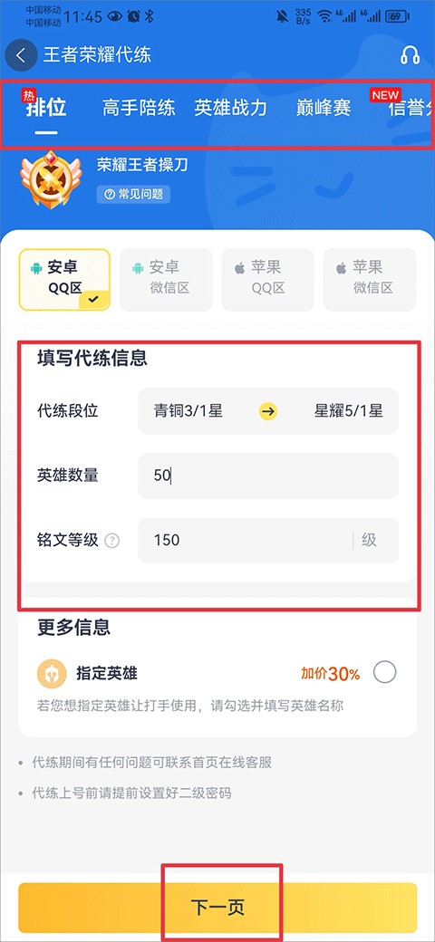 3进入后可选择排位代练、高手陪练、巅峰赛、赏金联赛等服务类型,以排位赛为例,需先完善代练相关信息,再点击下一步操作。
