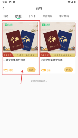 3、在护照商品列表中,点击环球文旅集章护照本商品条目,进入商品详情页。