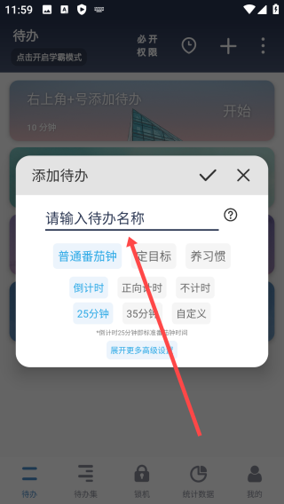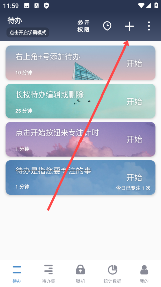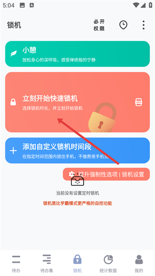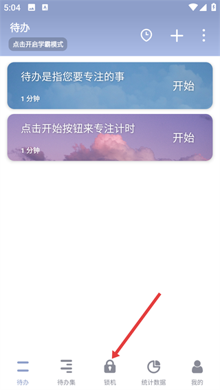 1、打开番茄ToDo软件,在待办界面点击底部的【锁机】选项,就能进入锁机功能页面啦。