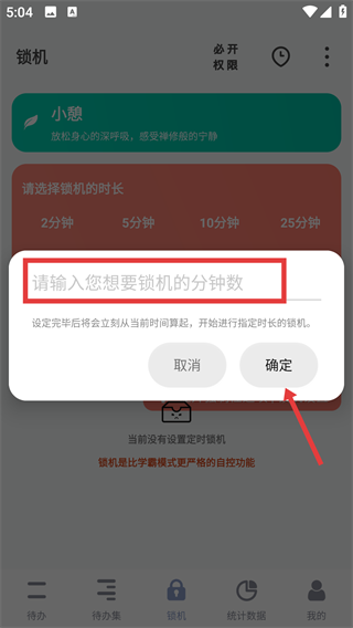4、在自定义弹窗的输入框内填入你希望锁机的分钟数,确认无误后点击【确定】按钮,即可开启对应时长的锁机功能。