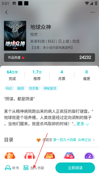 4、在地球众神详情页面,点击加入书架,将书籍加入书架。