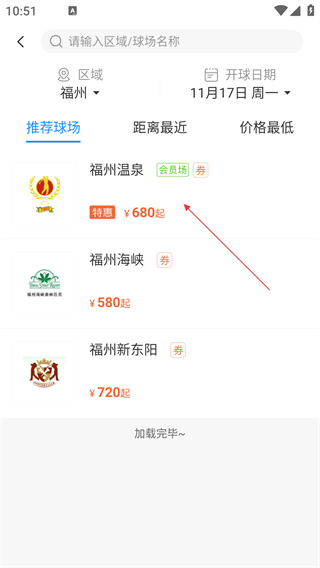 2、进入订场页面后,可根据推荐、距离、价格等筛选条件,选择如【福州温泉】类球场。